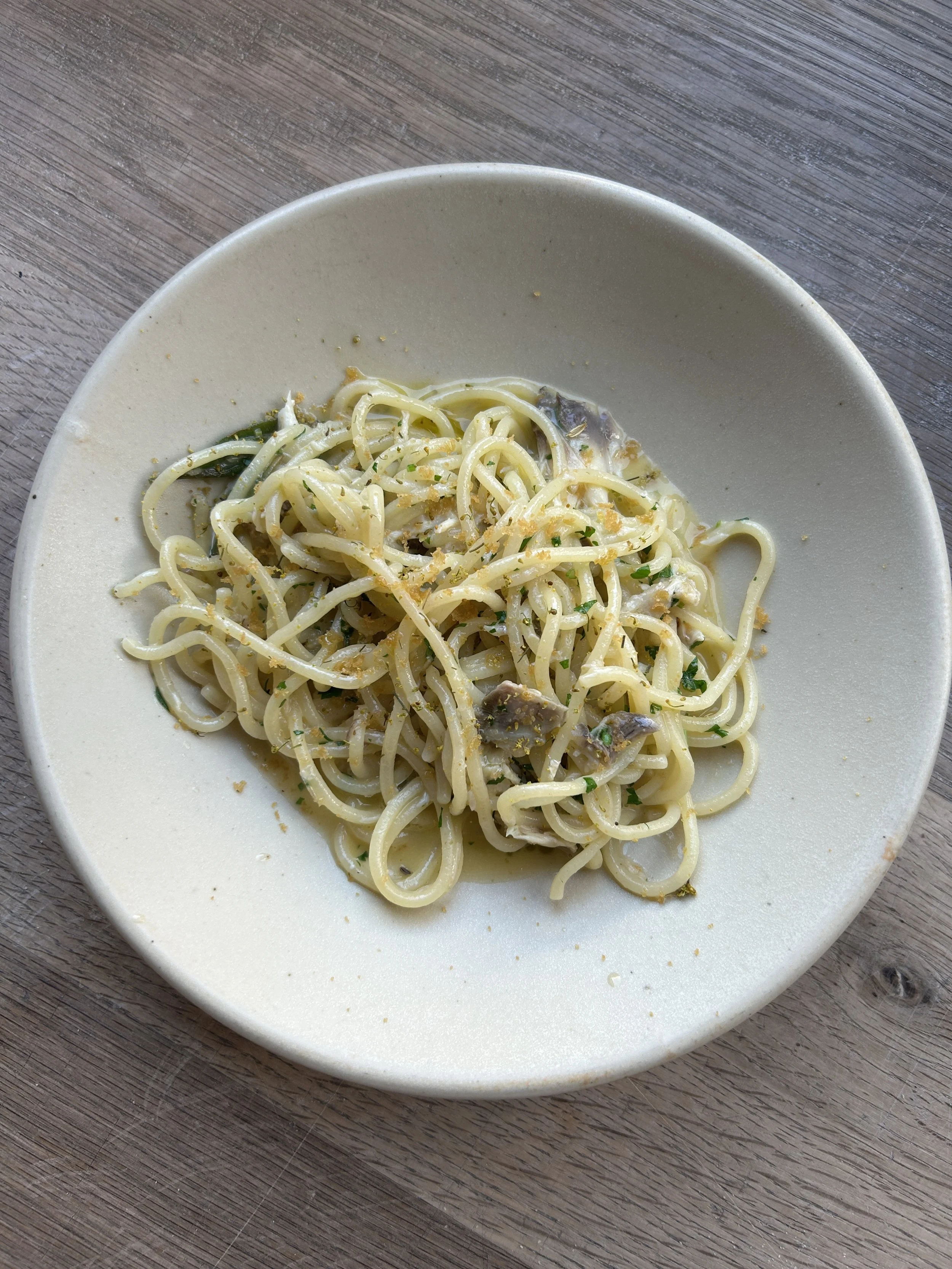 This dish closes the 'nose to tail' cycle of the fish we use for crudo. we use grey mullet for this when the seabass fishing season is banned a couple of months a year as we don’t use farmed fish. The heads and collars get grilled and the meat picked. The sauce is made with a smoked fish stock (using the frames of the fish), bottarga (from the roe), butter, lemon, sea herbs & fennel pollen.