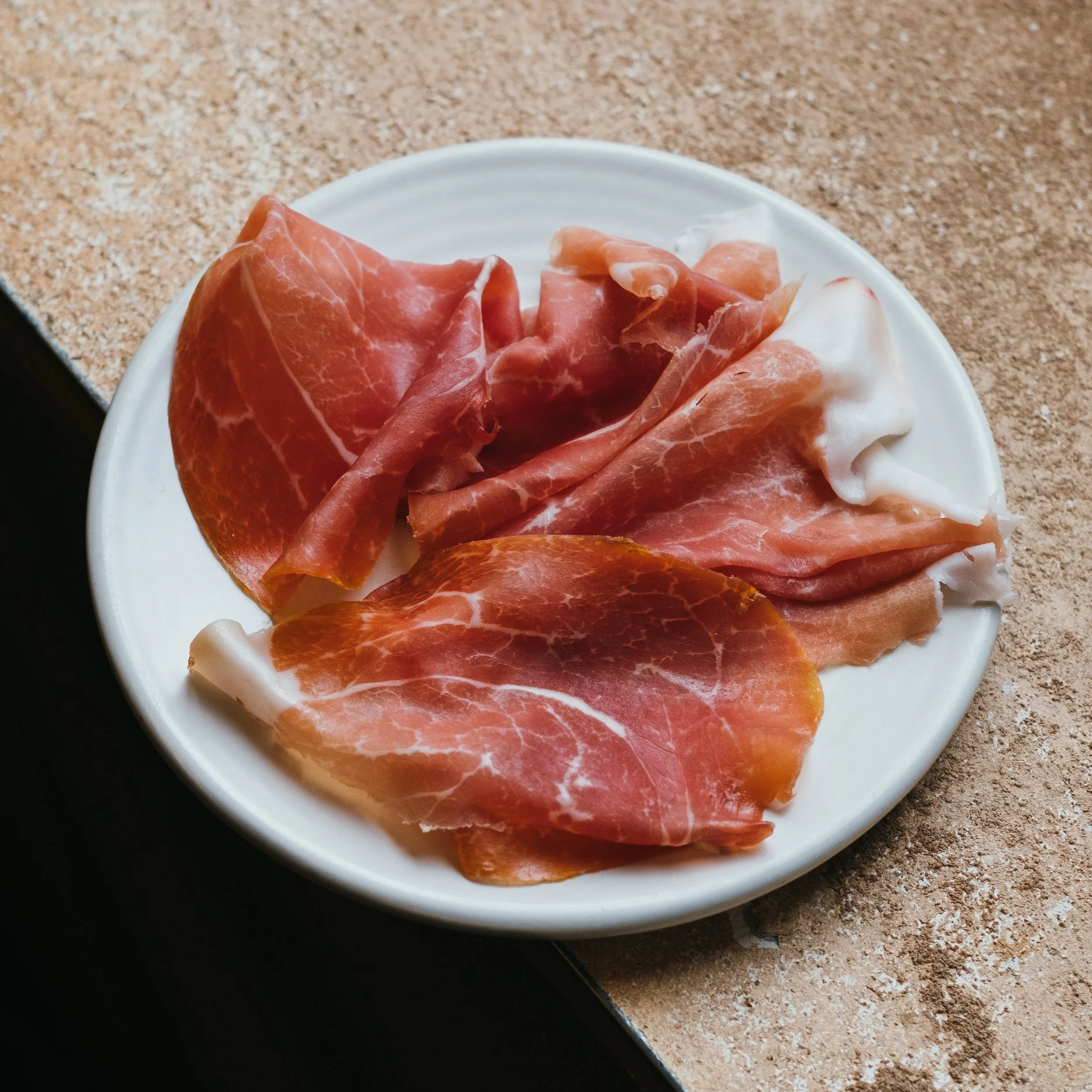 bresaola - air-dried salted beef that has been aged two or three months until it becomes hard and turns a dark red, almost purple color. It is made from top (inside) round, and it is lean and tender, with a sweet, musty smell. It originated in valtellina, a valley in the alps of northern italy's lombardy region.