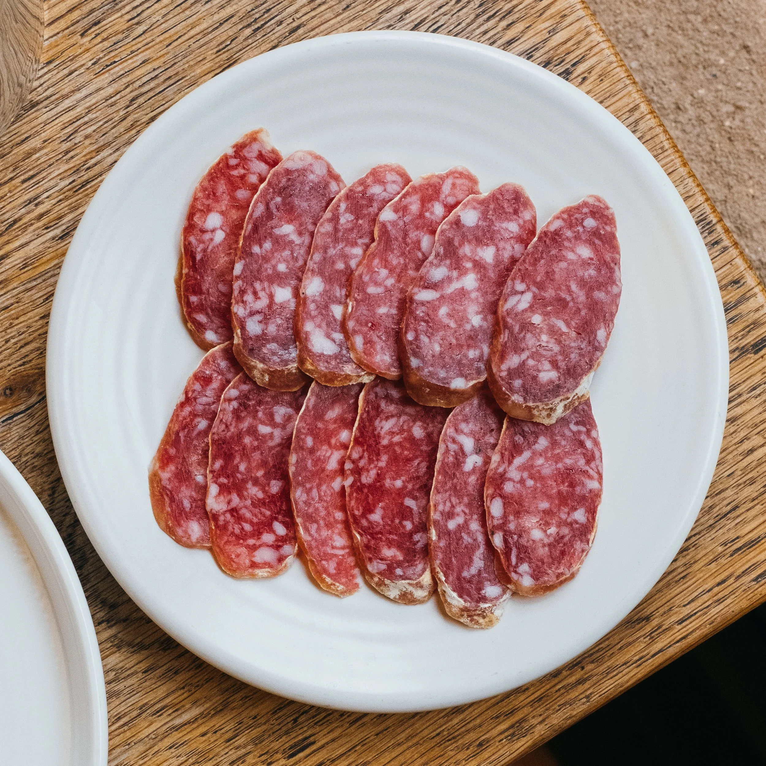 salami – cured sausage marbled with cubed fat, lightly fermented. cut slightly thicker for textural purposes. made using lean meat and fat from various areas of the pig. various salami flavours - fennel pollen, black pepper, bergamo [red wine], toscano [tuscan red wine] szechuan and fennel.