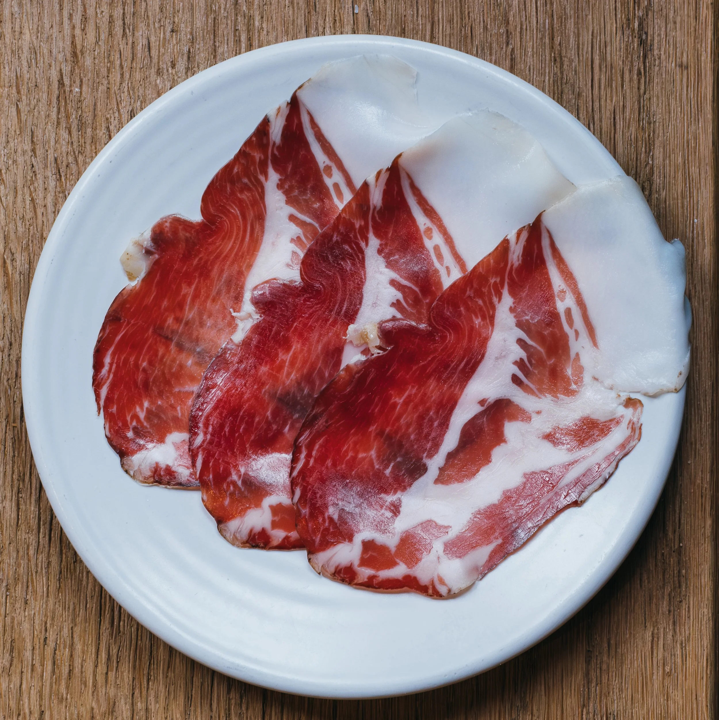 coppa – cured shoulder of pork taken from the neck end. highly marbled with fat due to the cut.