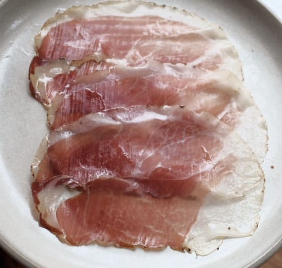 speck – cured, lightly smoked whole muscle from the pork leg. fat content is similar to culatello and prosciutto. lonza – cured pork loin. lean with a strip of fat on the outside [think back bacon in appearance]